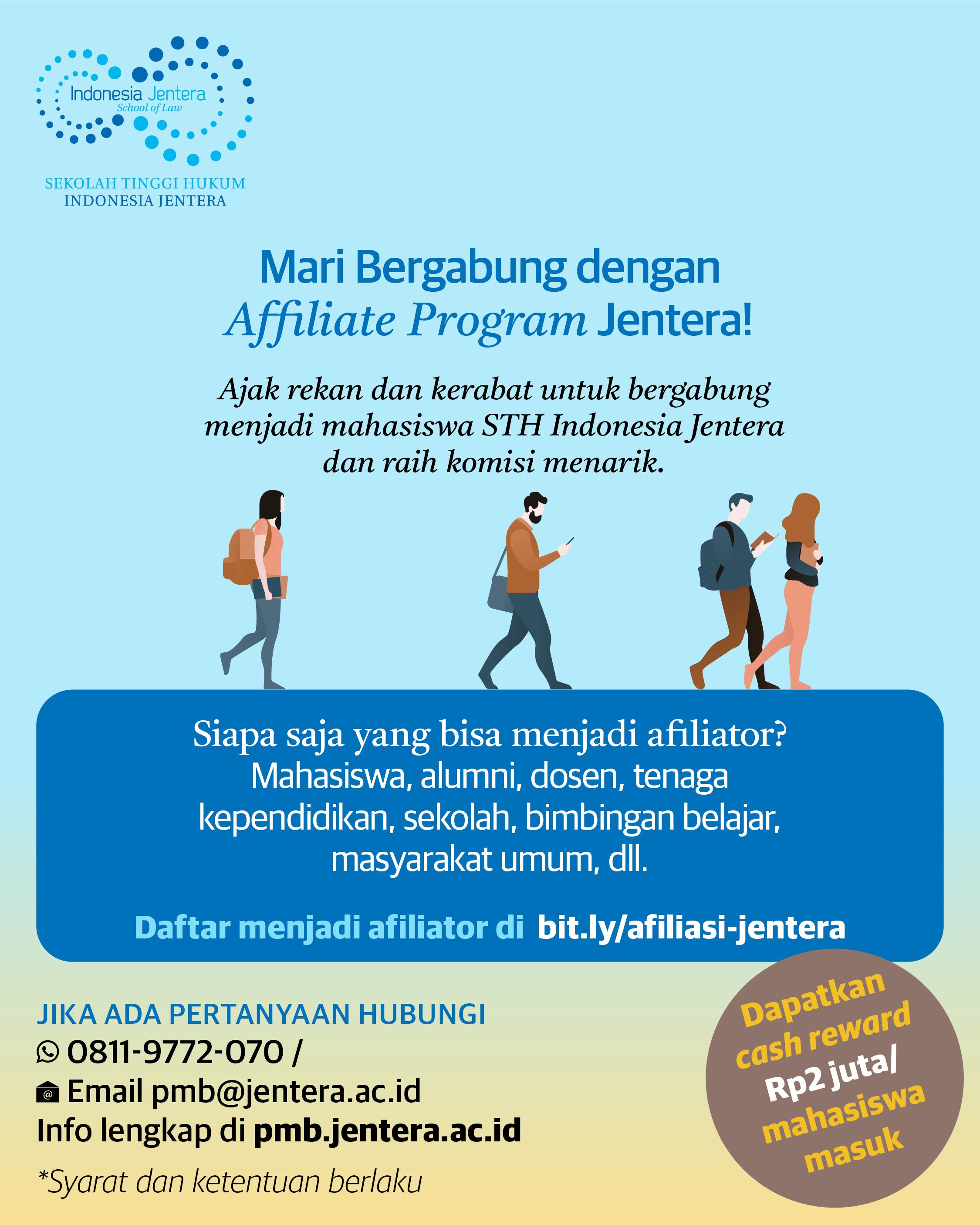 Ajak rekan dan kerabat untuk bergabung menjadi mahasiswa STH Indonesia Jentera dan dapatkan komisi sebesar Rp2 juta/mahasiswa masuk.